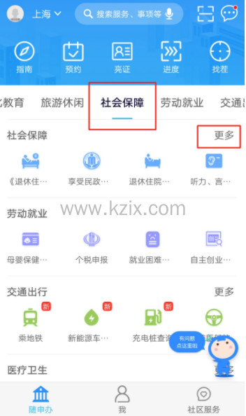 第二步:然后注册登录成功,可在下方菜单栏找到“随申办”,然后点击在页面菜单栏中找到“社会保障”,点击更多(如下图所示)