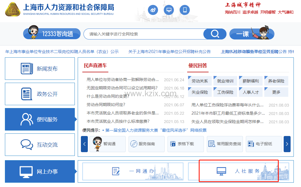1、上海人力资源和社会保障局官网,点击“人社服务”