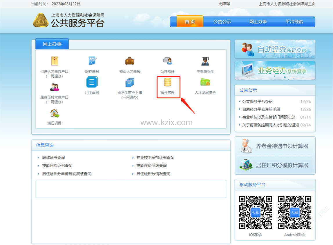 点击上海市人力资源和社会保障局官网,点击人社服务-点击积分管理,即可进入2024上海居住证积分管理信息系统。