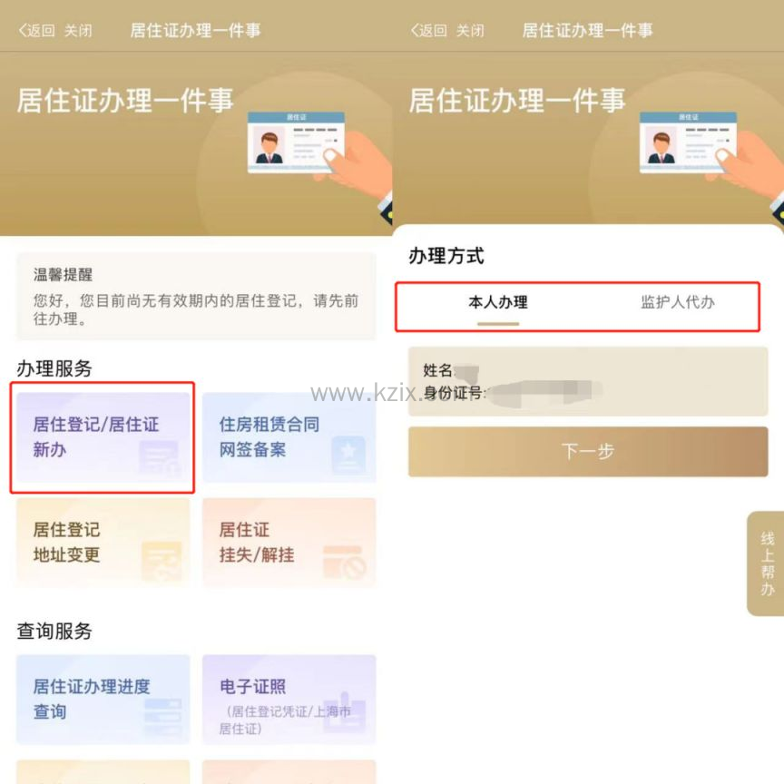 在【居住证办理一件事】服务页,选择【居住登记/居住证新办】进入,并选择办理方式:本人办理/监护人代办;