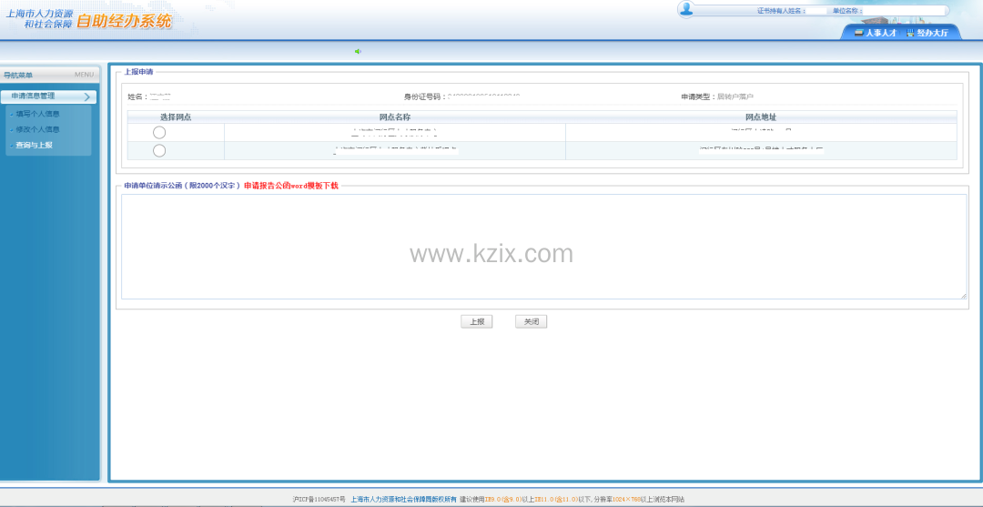 附件上传完成后点击上报,然后选择申报网点,并严格按照系统样张填写好《申请单位请示公函》,最后点击“上报”,到此居转户的信息填报工作就完成了