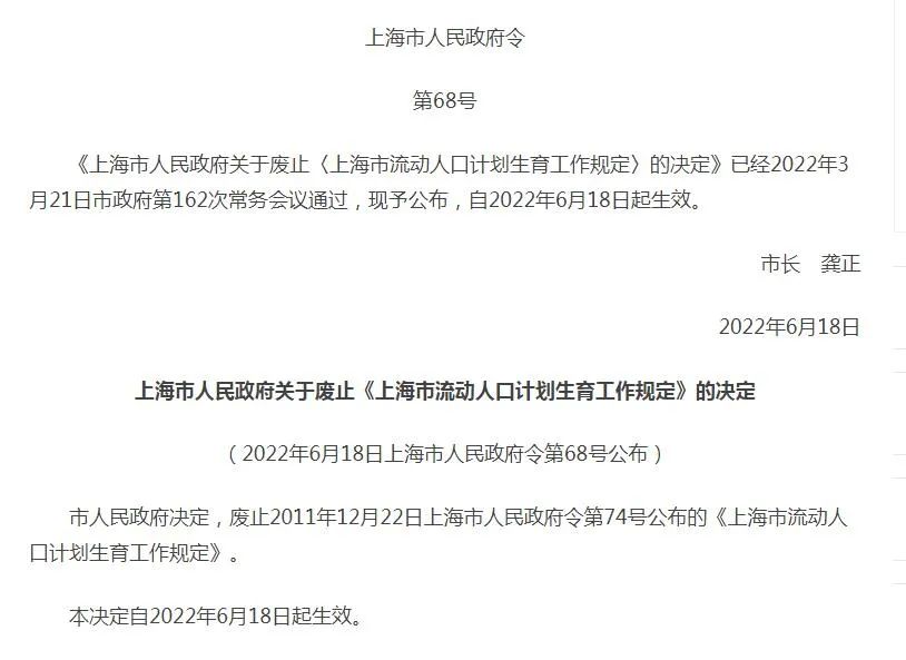 最新政策出台,上海人力资源社会保障部发布了《上海市人民政府关于废止《上海市流动人口计划生育工作规定》的决定(沪府令68号)》,上海发布废止《上海市流动人口计划生育工作规定》的最新决定,让涉及超生、二胎三胎以及未婚先育的都有机会申请积分及落户了!
